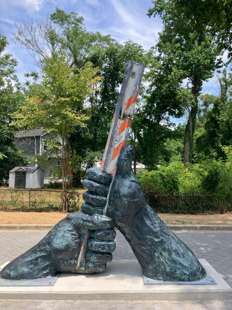 Now, that metal barrier has been repurposed into a sculpture that was unveiled at a new park on June 29. The piece of metal that once served as a marker of separation is clasped between two hands of the sculpture in a symbol of unity.